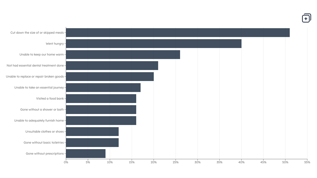 Data Cost of living Our latest data charts show low-income families continue to face severe hardship, often going without essentials such as food and heating, with lasting impacts on health and wellbeing.