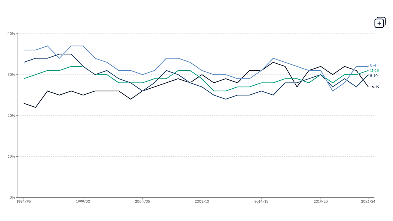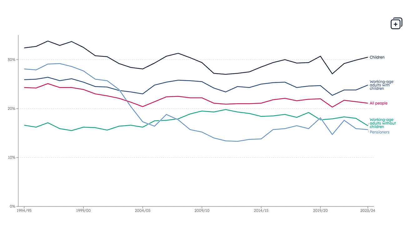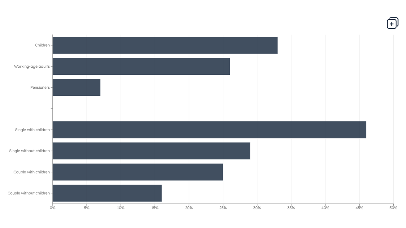 Data Overall poverty rates for children, working-age adults and pensioners Our latest data charts show clear differences in poverty rates across age groups, with children and people in lone-parent families at highest risk.