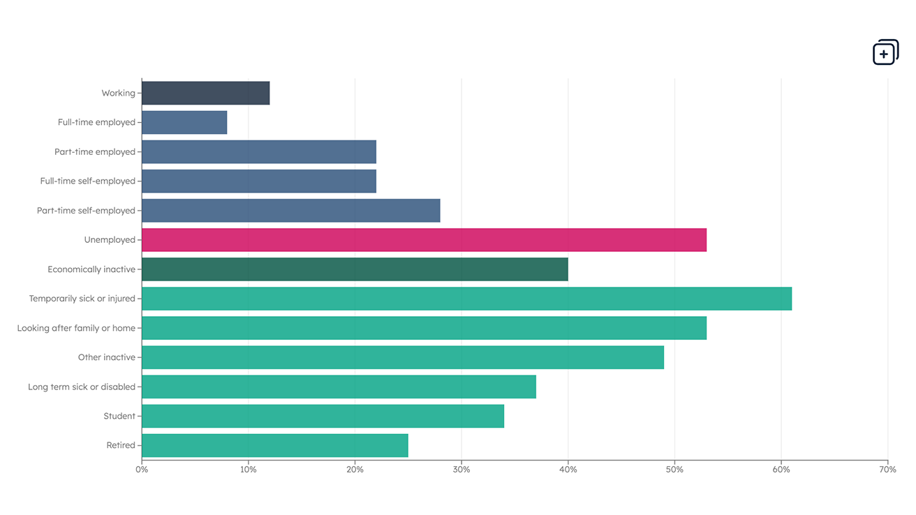 Data Health Our latest data charts show working age adults in poverty are more likely to report poor health which gets worse with age and low-incomes are linked with higher rates of anxiety.