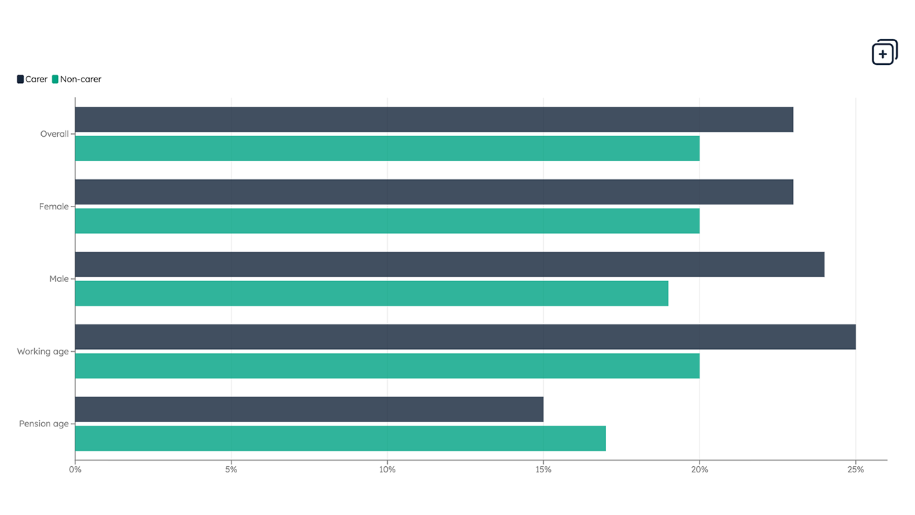 Data Carers Our latest data charts show carers are more likely to live in poverty, as balancing paid work with caring responsibilities often brings lower incomes and extra costs.