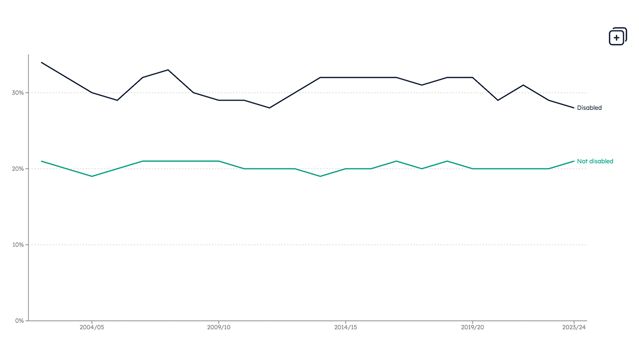 Data Disability Our latest data charts show disabled people are far more likely to live in poverty, driven by extra costs, barriers to work and inadequate income support.