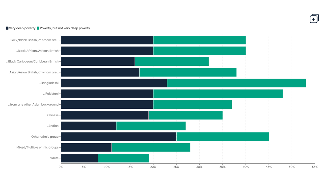 Data Ethnicity Our latest data charts show poverty rates differ sharply by ethnicity, with many minoritised ethnic groups far more likely to experience poverty and very deep poverty.
